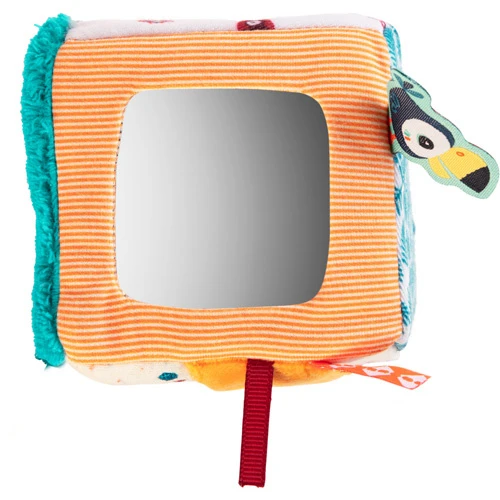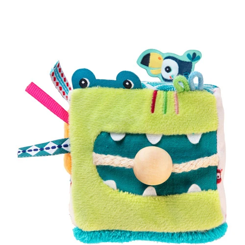 Ontdek de activiteiten en verhaaltjes van deze zachte kubus rond het junglethema. De bijtring biedt verlichting bij doorkomende tandjes.Stimuleert de zintuigen, fijne motoriek en het vastpakken. 8x8x8 cm.